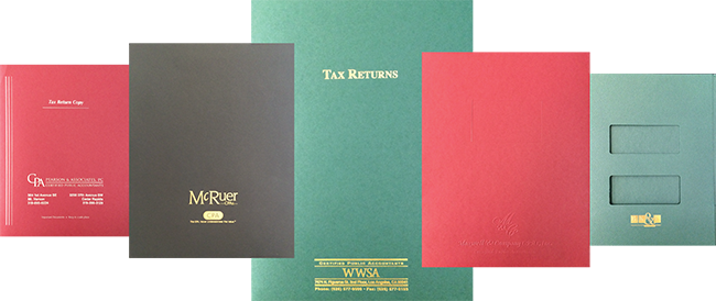- Many stock dies for folders and covers to accommodate tax returns and reports.